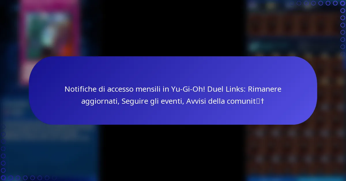 Le notifiche mensili di accesso in Yu-Gi-Oh! Duel Links sono avvisi che informano i giocatori su eventi imminenti, aggiornamenti della comunità e ricompense per l’accesso al gioco. Queste notifiche aiutano i giocatori a rimanere coinvolti e informati sugli sviluppi del gioco e sulle promozioni speciali.